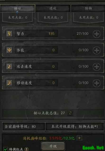 每提升一级巅峰等级,可获得核心、进攻或防御点数,其中核心点数可用于提升攻击速度。