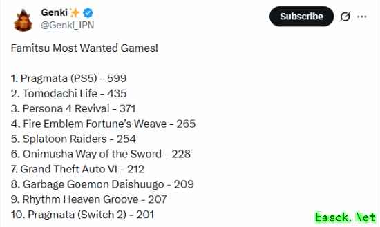 今日,X博主Genki_JPN发布了最新一期《Fami通》中最期待游戏前十名的排行,一起来看看吧。