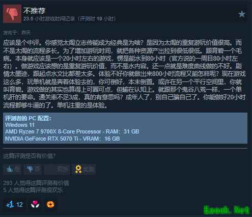 给出好评的玩家表示,本作的可玩性与可复玩性较高,游戏框架扎实,期待官方尽快开放创意工坊,相信会带来更多游玩乐趣;还有玩家提到,游戏的自由度十分出色,能充分满足玩家的探索需求。