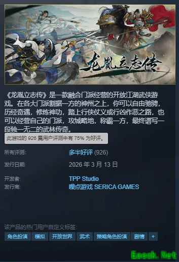 据了解,武侠游戏《龙胤立志传》于3月13日上线Steam平台,目前该平台上的评价为“多半好评”。