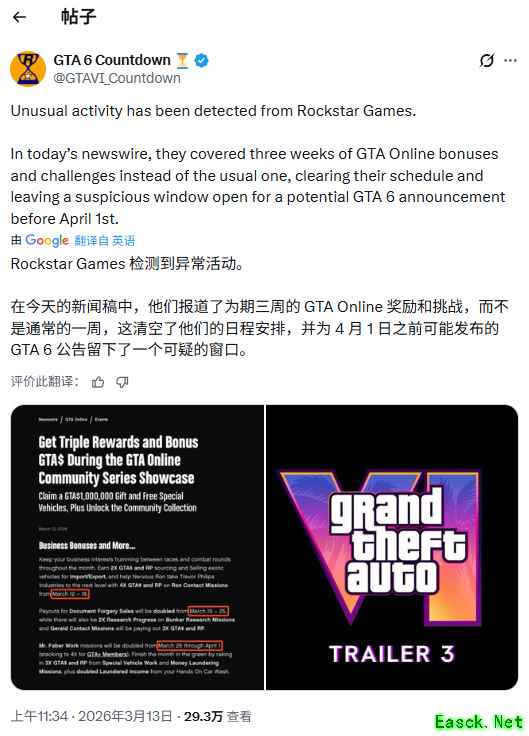 R星近日在官网发布新一期新swire博客,详细介绍《GTAOnline》社区展示活动内容。有玩家注意到,此次博客一次性公布了3月12日至4月1日三周的线上模式奖励内容,与通常每周更新一次的节奏明显不同。这一变化引发部分玩家猜测,R星或为即将到来的《GTA6》消息“腾出空间”。