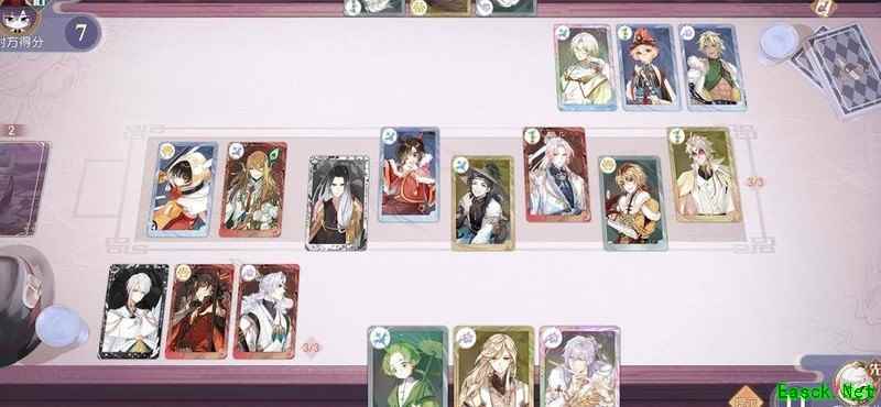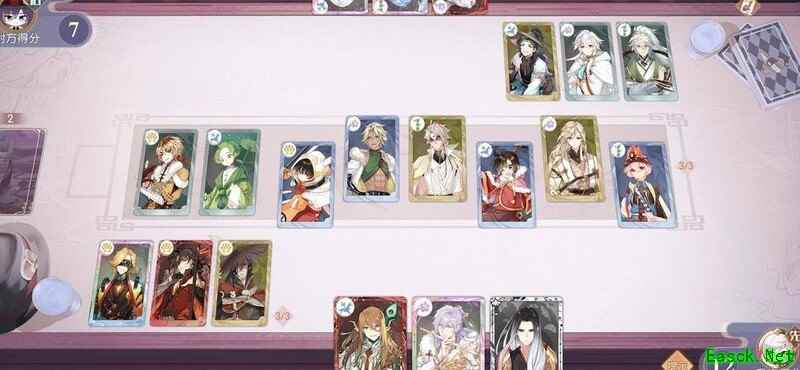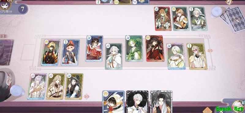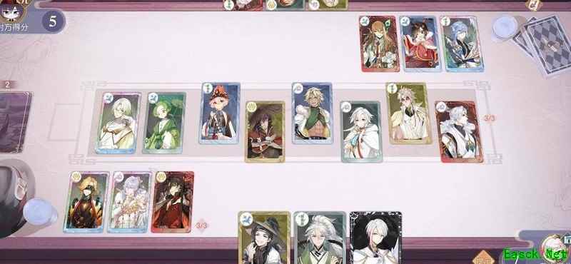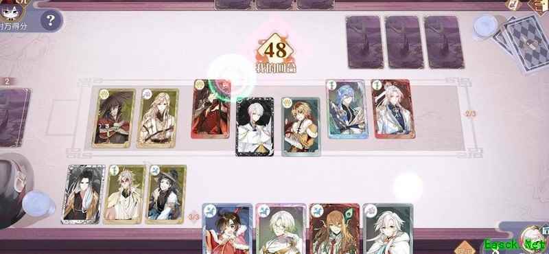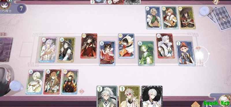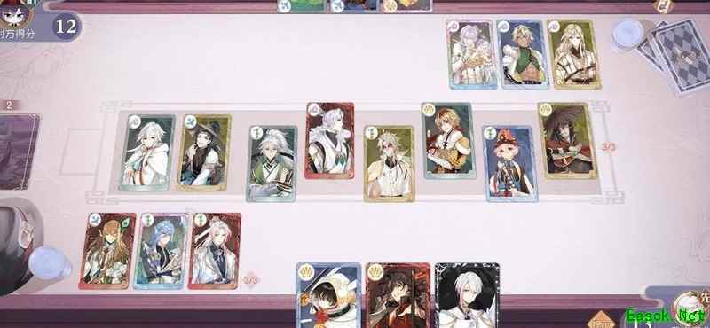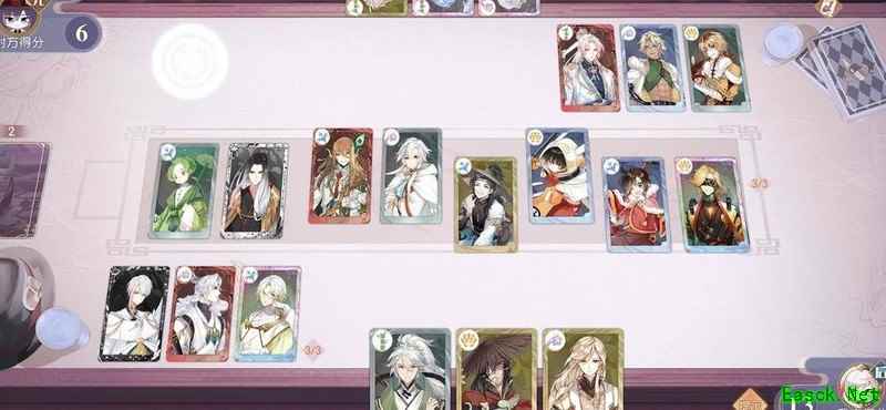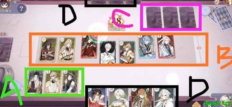 系统将轮流为双方发牌,对方需选择将牌放入C区或B区,随后我方也获得一张牌。此过程持续进行,直至A区与C区各填满三张,B区共八张(初始两张加上双方各出的三张)。所有牌放置完毕后,进入最终计分阶段。