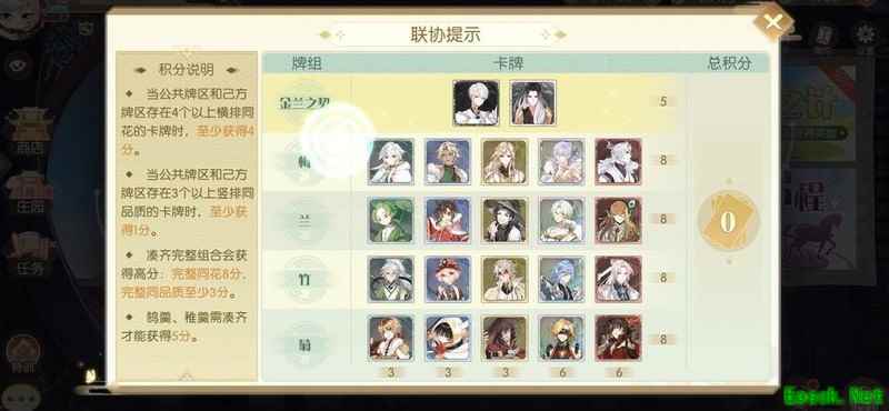 接下来谈谈牌的构成。整副牌共22张,其中鹄羹兄弟可视为大小王,其余20张分为四种花色——梅、兰、竹、菊,每种五张;也可按五种底色划分,每种四张,对应服饰与御珍尚良组。游戏的核心目标是将能构成得分组合的牌尽可能多地收入我方的计分区域(A+B),同时确保总分超过对手(B+C)。计分方式以三张为基本单位,相同花色或相同底色的牌组合即可得分。牌数越多、底色越鲜明,得分越高,其中御色尤为珍贵,带来的分数优势最为明显。