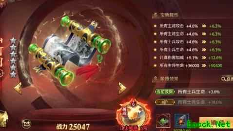 该宝物同时提升主将攻击百分比、计谋伤害加成及主将攻击固定值,综合增益效果显著,在同类红色宝物中表现突出,对整体阵容的强化作用更为明显,是提升战力的优选配置。