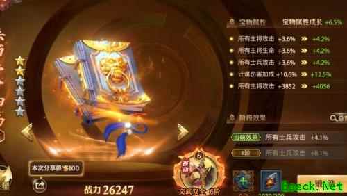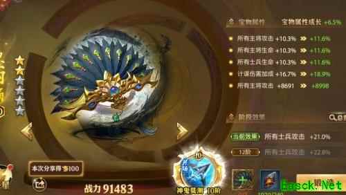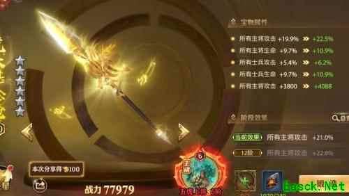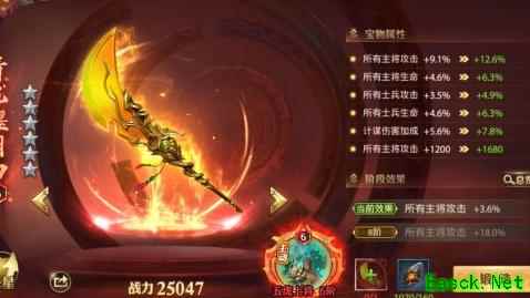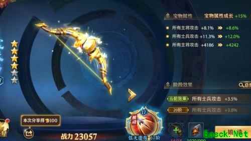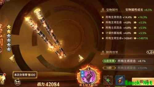 该宝物是金色品质中主将攻击百分比加成最高的,同时增加主将固定攻击力,尽管缺乏计谋加成,但因其综合属性优势,仍是升星优先选择。
