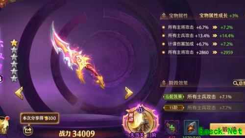 推荐理由:多数紫色宝物属性加成偏低,但与具备主将攻击百分比提升、计谋伤害加成及主将攻击固定值提升三项优势,整体增益更为全面且幅度较高,相较其他紫装更具培养价值,建议优先升星以充分发挥战力潜力。