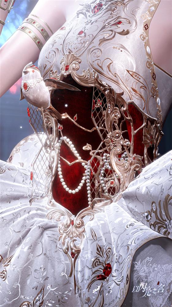 鞋子的设计已经如此用心了,套装的设计概念和主题更是一目了然。要将中国传统德化白瓷与泉州提线木偶戏的设计元素融合在一套服装上,还是有很大挑战性的,除了整体的用色和陶瓷的质感之外,此次的傀儡之章新版本的主推套装还增加了许多更有趣的设计。比如为了凸显腰部的线条,在参考前期发条之心套装镂空腹部的设计之外,这一次官方给这个镂空的设计加入了浓墨重彩的一笔。正如在版本宣传片中看到的那样,一只点缀着各种宝石和水晶的金属小鸟,仿佛为这个镂空设计注入了灵魂。更惊喜的地方在于,镂空双开门鸟笼打开的时候,居住在其中的小鸟便会飞奔而出,与角色紧紧相随并进行专属的亲密互动。