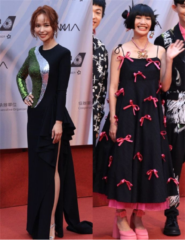 还有这高叉腰的黑色礼裙以亮片点睛,右边黑色桶裙的蝴蝶结也十分抢眼,不得不感叹她们在造型上总有突破想象力的一面,给了红毯一道新鲜的色彩。