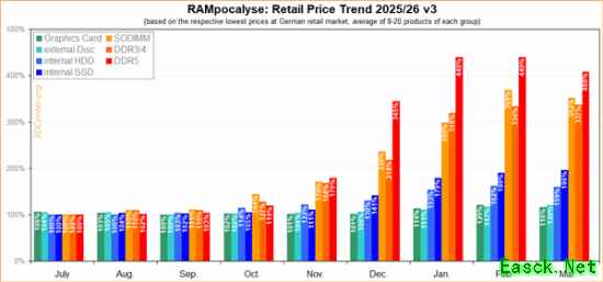 但要明确的是,此次降价并不意味着DDR5内存价格会在短期内恢复到过往的正常水平。在德国市场,DDR5内存价格从去年9月开始上涨,去年12月更是迎来暴涨,目前其平均价格仍比去年7月份高出308%。