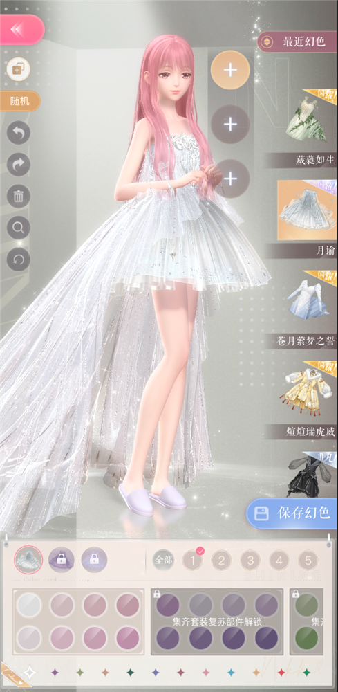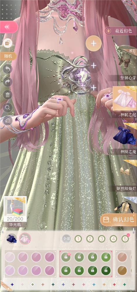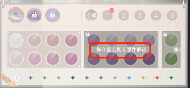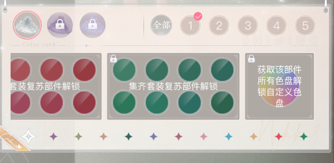 接下来是闪暖的染色门槛。获得可染色时装后,只有1个提取色色盘可用,无卡套装需在套装集齐后才能解锁10个色盘;带卡套装需在套装集齐,并对套装进行复苏后才能解锁10个色盘,全部色盘解锁后开启自定义调色。