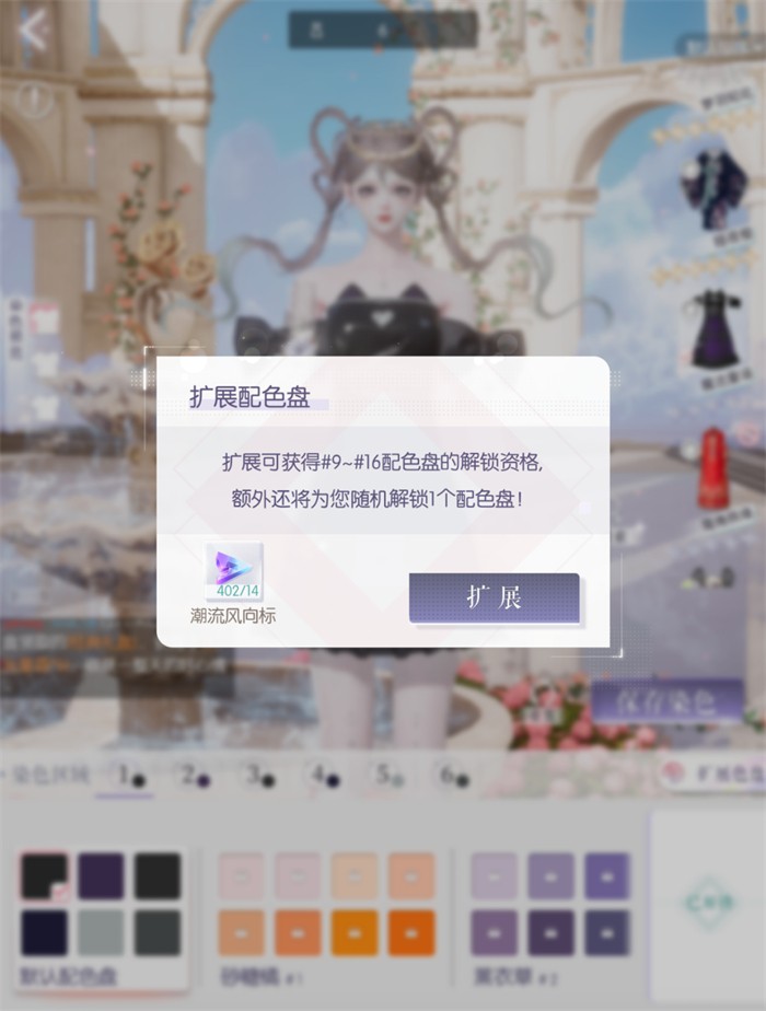时装后8个色盘需要用风向标进行拓展,拓展后额外赠送1个色盘,三星时装使用基础风向标拓展,道具可通过日常和金币获取;四星至六星散件、活动时装使用潮流风向标拓展,道具可通过日常、钻石和点券获取;四星至五星套装使用专属风向标拓展,追光(服装池抽取)时装通过分解重复部件获取,心意之期、代言女王、时尚对决时装可制作、兑换专属风向标。