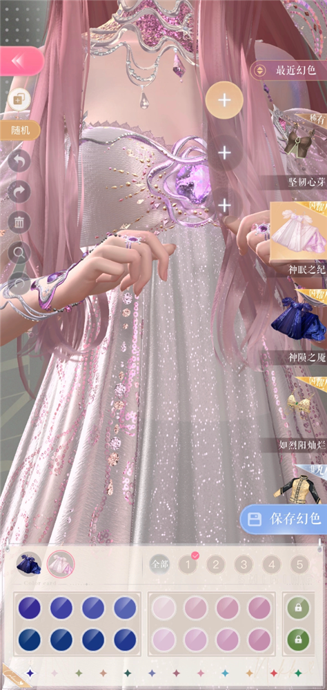 解锁后8个色盘后可升级解锁千幻色域,也就是无限色盘,玩家可以自由调节时装不同染色区域的色相、明度、饱和度,并且支持输入RGB六位色值,任意一种颜色都能调出来。值得一提的是,不论基础色盘还是千幻色域,所有等级时装和任意部件都支持。