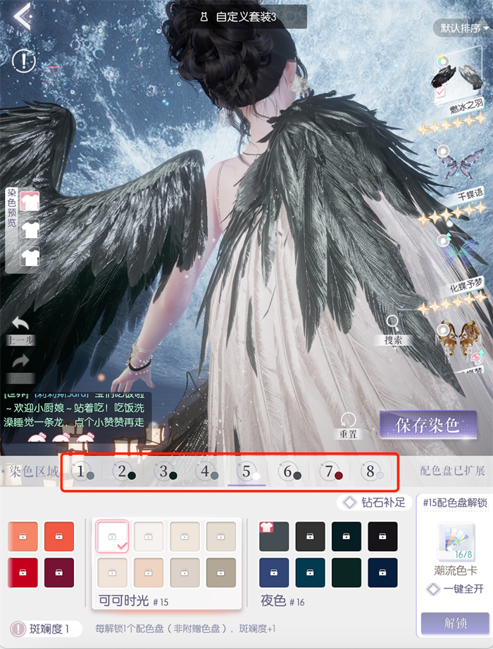 首先是染色效果。以闪根据服装、配饰不同的版型、纹样设计了不同的染色分区,以六星爱神套装为例,翅膀这个部件带有粒子特效,所以分了8个可染色区域,包含特效都能染。染色前后羽毛质感也没有变化,反而能通过染色呈现出不同的效果。