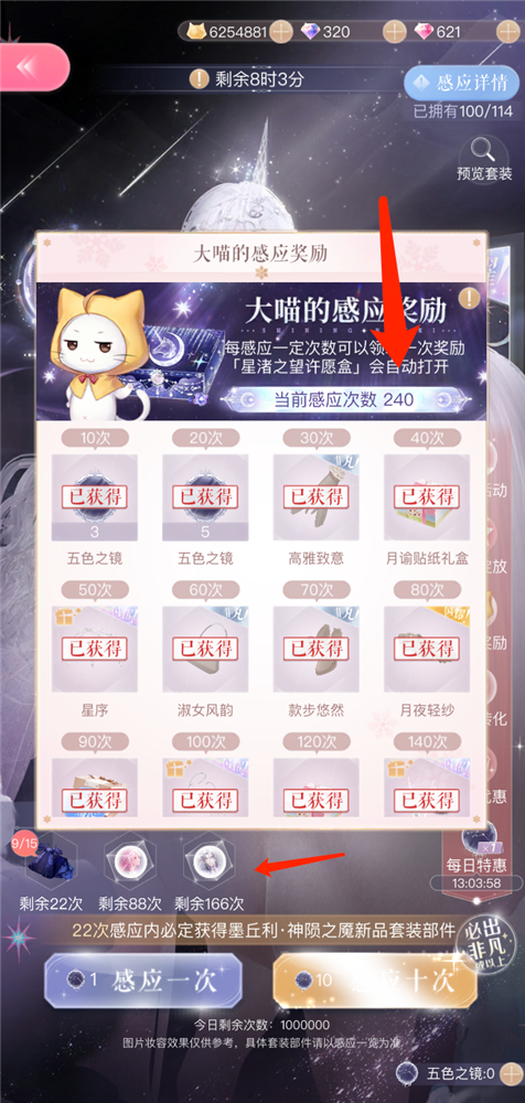 以闪暖周年庆的独角兽套装为例,想要对该套装进行染色,需要抽取一共17个部件,以及2张卡。如下图抽取的次数所示,目前一共抽取了240次,套装集齐了,但是第二张卡保底需要88抽,对于资源不够的玩家来说,需要充值才能达到染色的门槛。