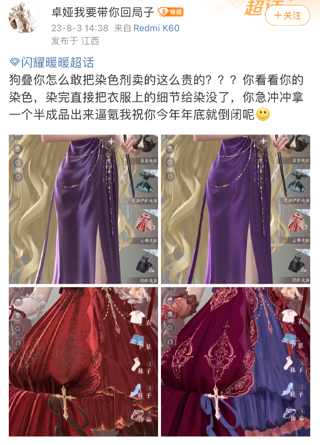 其他闪耀服装也是类似的效果,甚至下图这件本身带渐变的裙子,在染色后渐变消失了,还不如不染。