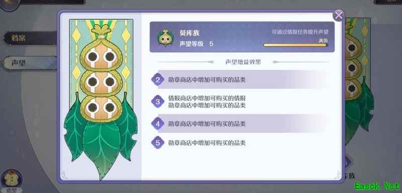 莫库族声望界面右上角显示可通过情报任务提升声望,而其他阵营均标注为可通过委托任务提升声望。