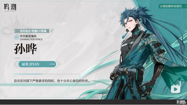 在PV播出之前,鸣潮开发组邀请了共鸣者角色的声优老师们为玩家们送上真诚的祝福,一共有男漂泊者、女漂泊者、秧秧、炽霞、白芷、安可等大部分1.0版本的共鸣者角色。不得不说,忌炎的声优老师——孙晔,真的是劳模啊!