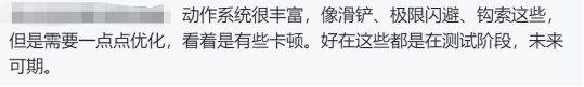 云玩家最难体验到的,就是游戏的手感。《鸣潮》的动作效果已经足够绚烂,符合一个二次元玩家对于一款优质游戏的预期,比如玩家评论“滑铲”、“极限闪避”、“勾索”等动作,丰富了战斗系统,同时“看着是有些卡顿”。