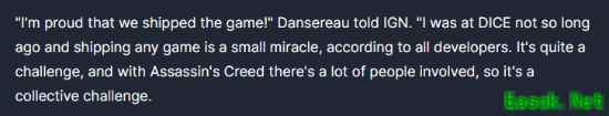 在游戏一周年纪念活动上,艺术总监Thierry Dansereau接受了IGN的采访,制作人表示:“我为我们的成功发售感到骄傲!不久前我参加DICE峰会,听同行说,任何游戏能发售都是个小奇迹。这对《刺客信条》这样的大型团队更是集体挑战。”