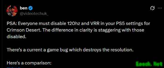 “建议所有玩家在PS5设置中关闭120Hz和VRR(可变刷新率),关闭后画面清晰度提升非常明显。”他指出,目前游戏存在一个Bug,会导致分辨率表现异常,影响整体观感。