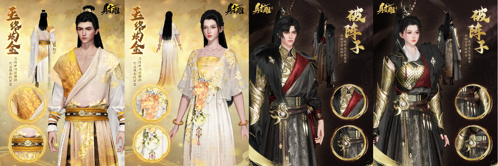 于此同时,衣橱也全面上新,或金戈铁马,或诗酒风流,切莫错过!全新外观“破阵子”和“玉络灼金”,以沙场烽烟与月华流转为主题,展现江湖儿女飒爽身姿。郭靖、黄蓉等六位侠侍专属服饰也同步开放,少侠可与同性别的侠侍穿着同款衣装携手同行。
