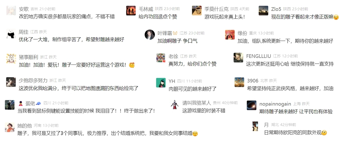 自上线伊始,《射雕》2.0版本便凭借全额返利、减肝减氪、自由武学等一系列举措,逐步赢回玩家信任。官方一系列动作引发了玩家的广泛讨论,大家纷纷表示看到了官方的诚意与用心,感慨“更新用心”“雕子争口气”,期望《射雕》越来越好。