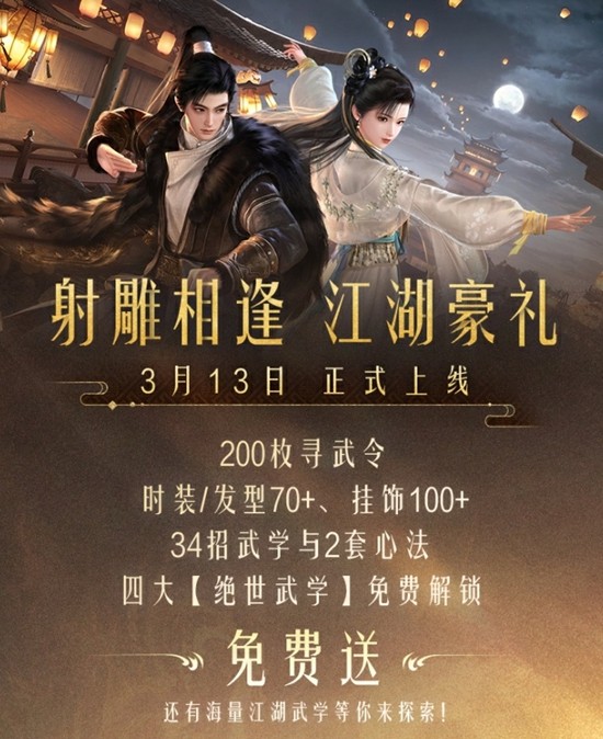 为庆祝《射雕》2.0版本正式上线,200枚寻武令、170+套外观、34招武学与2套心法免费送!四大绝世武学免费解锁,还有海量江湖武学等你探索!每一位踏入江湖的玩家都不用有外貌焦虑、数值压力,只需要玩得开心即可。