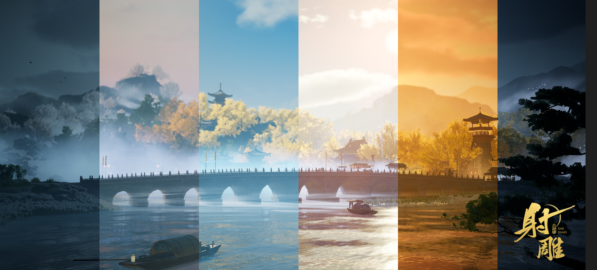 几次测试下来,《射雕》中留给各位少侠印象最深刻的,想必还是与真实事件完全同步的昼夜循环吧?项目组为十二时辰分别设计了不同的光影表现,且这十二时辰将完全按照现实时间演化推进,游戏里的一天,也是现实中真正的一天,当你抬起头,看见天边一抹残阳,那你便知道,现实也到了傍晚黄昏时段。