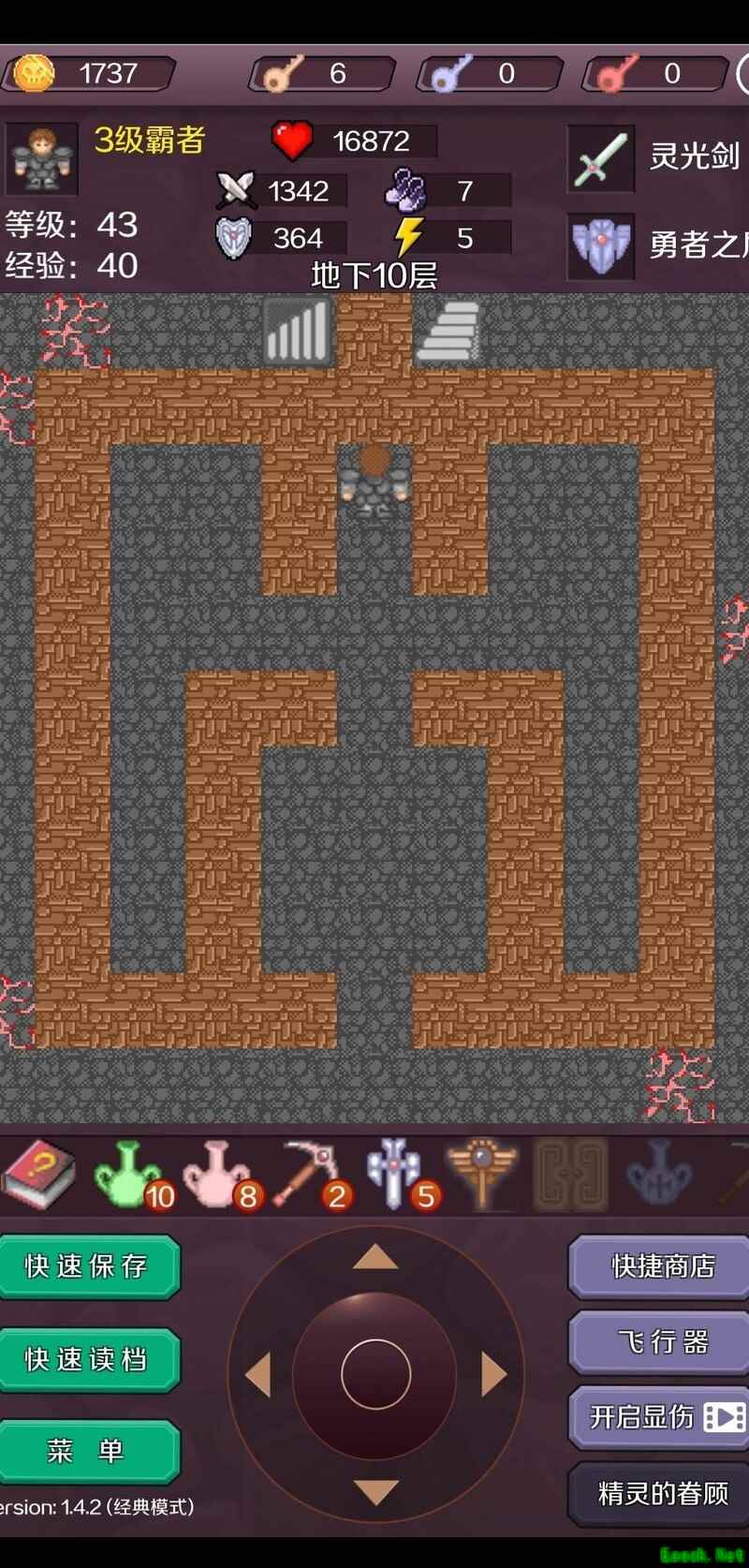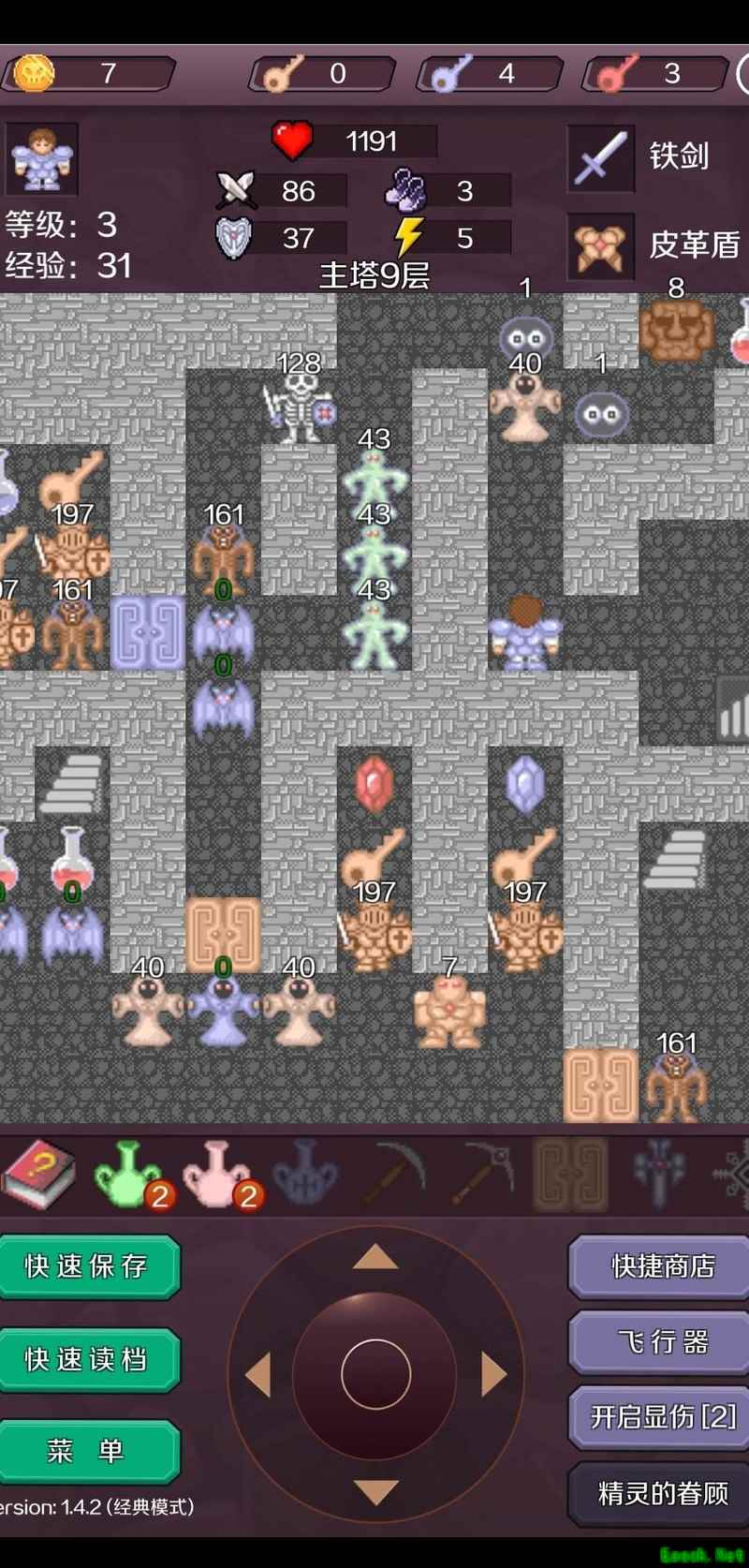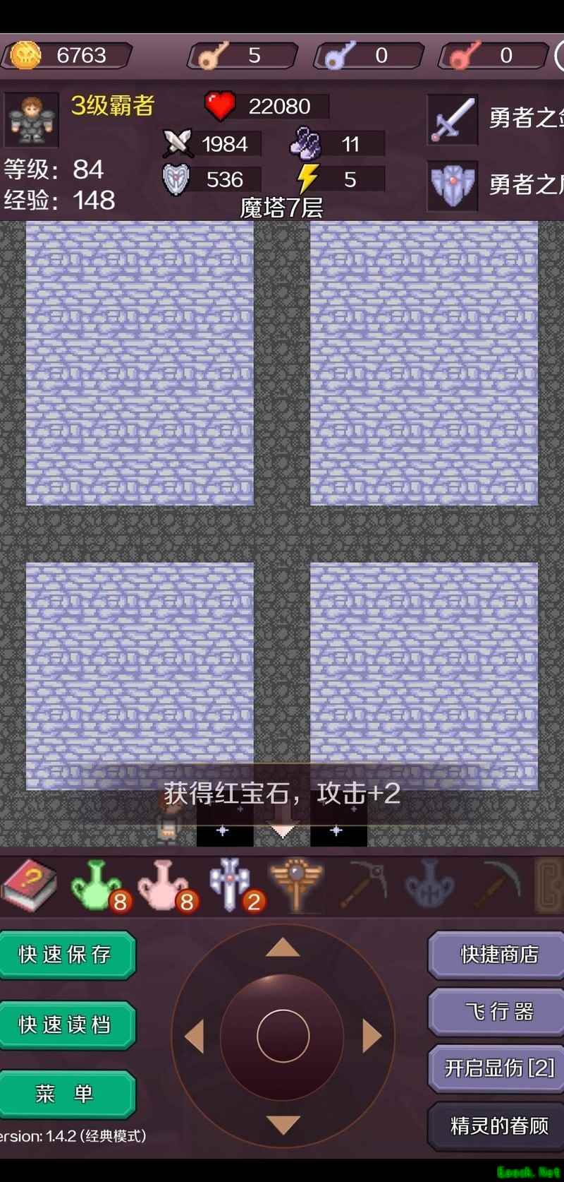 第七层开启黄门,击败骷髅兵获取钥匙;第六层打开黄门,击杀守卫与黄魔法师取得红宝石,积攒40金币后前往第五层向商人购买两颗红宝石,使攻击力提升至74。返回第六层,消灭大蝙蝠,开启黄门击败拦路怪物获得皮革盾,再购装备将攻击升至77。清理第五层的两只大蝙蝠及第八层左下角的大蝙蝠,确保无伤。第七层击倒右侧守卫与大蝙蝠,购买道具使攻击达到80。重返第八层,击杀途中怪物进入第九层,消灭两只大蝙蝠,继续购买提升攻击至86。