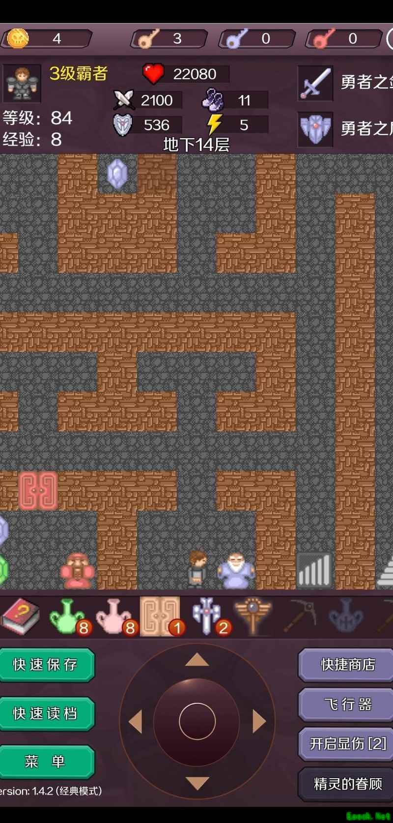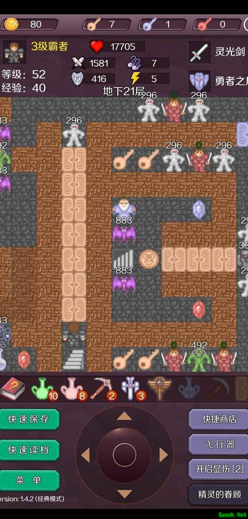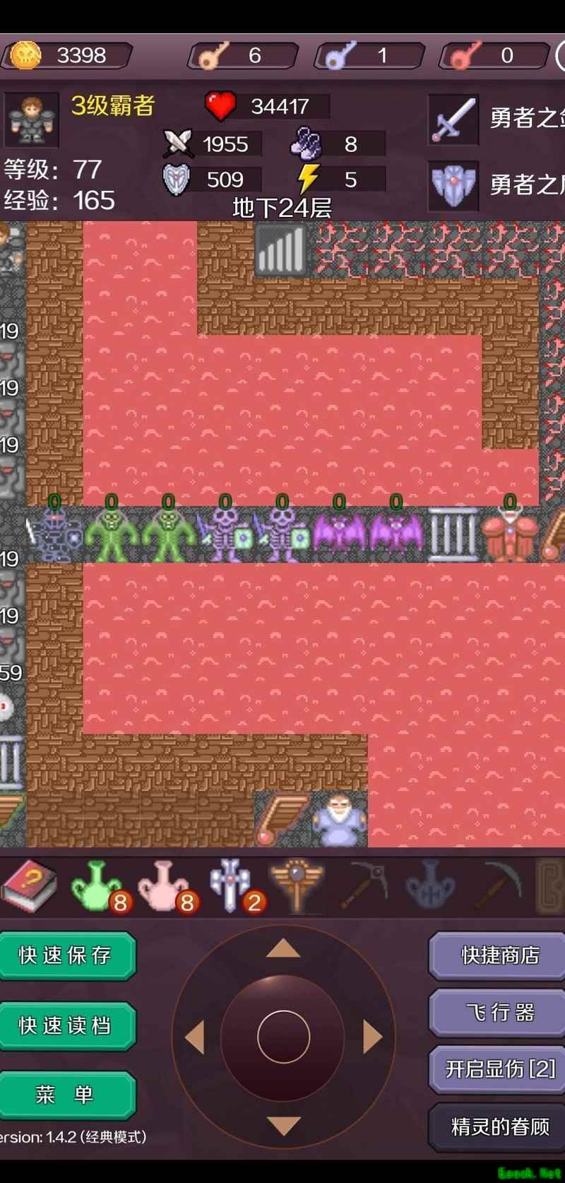 在B22层击败铁怪获取红钥匙,进入密室取得勇者之剑,将攻击力提升至1945,无伤消灭全部毒丧尸与白银人,连升三级达到77级,随后前往B24层。