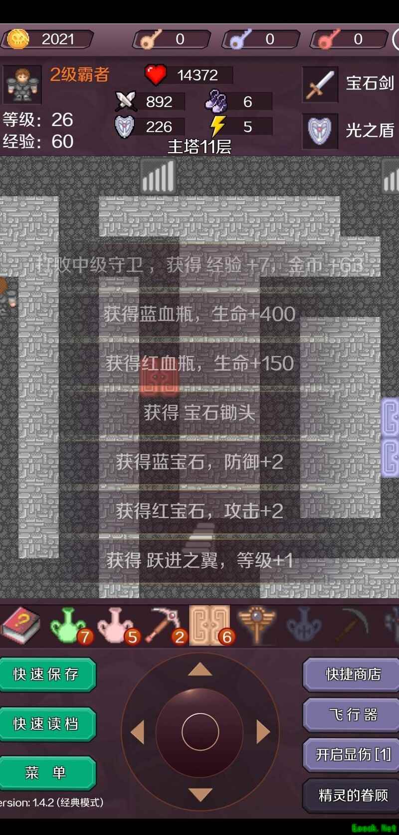 击败17层的大法师与两名蓝卫士获取盾牌,前往0层向小偷购得一把黄钥匙,进入密室2层消灭两只怪物取得红宝石。返回B7层,击杀蓝卫士获得任意门与铁剑;在B8层取得小飞羽,购买五把黄钥匙,清除途中两名蓝卫士后开启蓝门,获取红蓝宝石,再击杀最后一道阻碍的蓝卫士,无伤清理其余小怪后进入B9层。安全解决所有敌人,角色提升3级至24级,再购入一把黄钥匙,使用任意门进入宝石密室,取得小飞羽与红钥匙。离开密室,前往11层开启红门,击败怪物再获小飞羽。