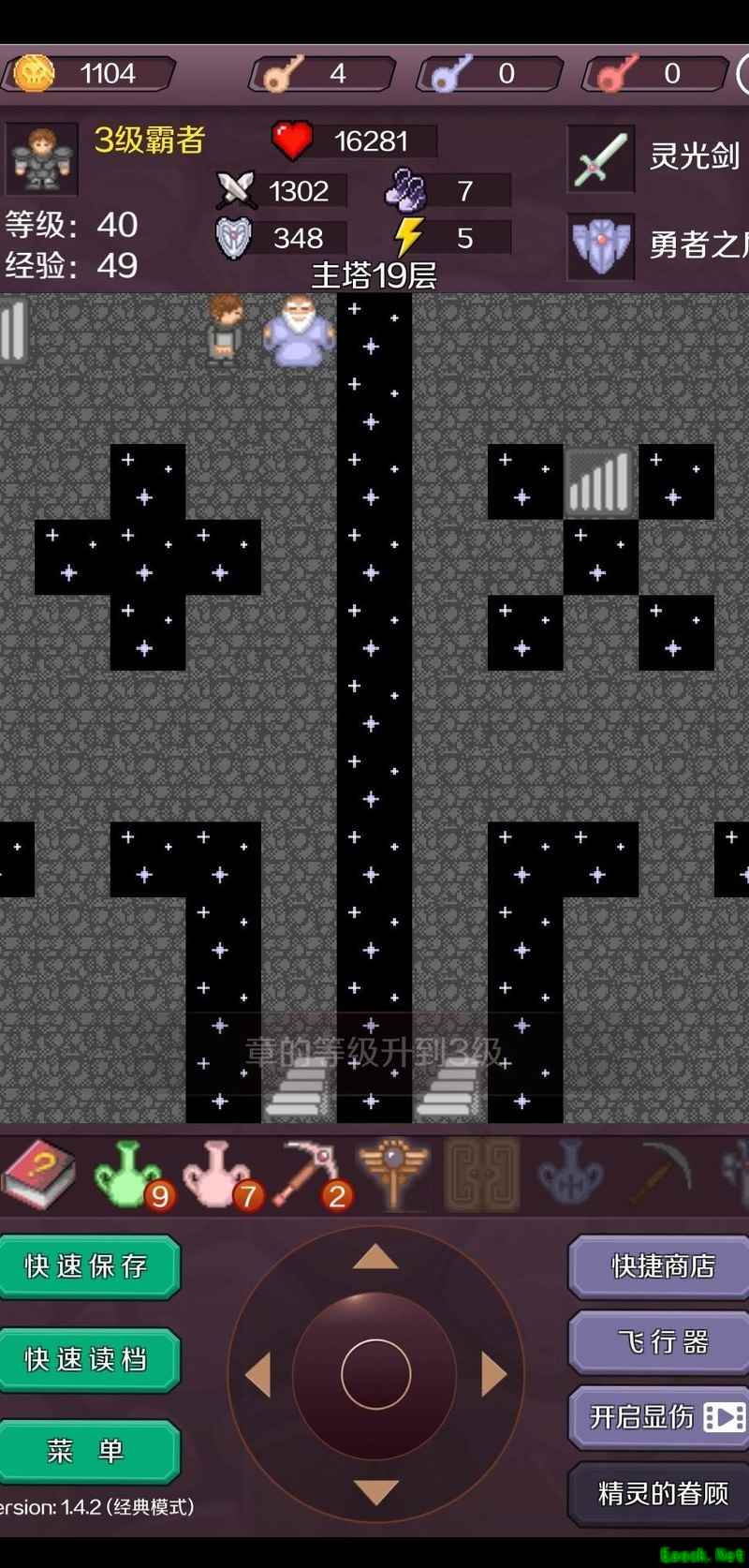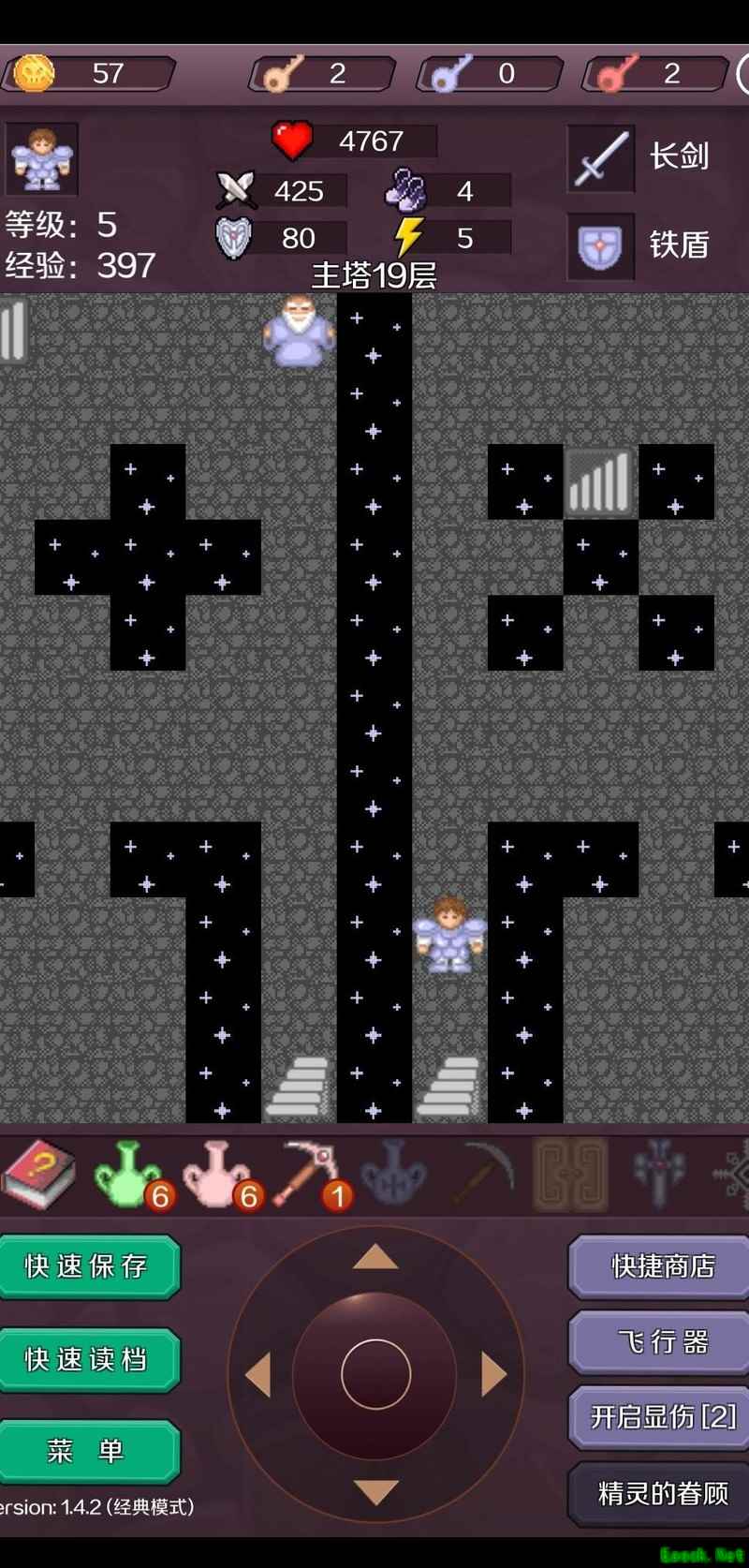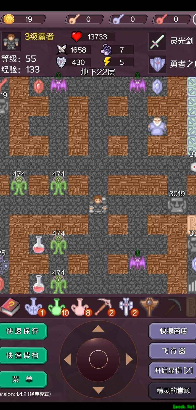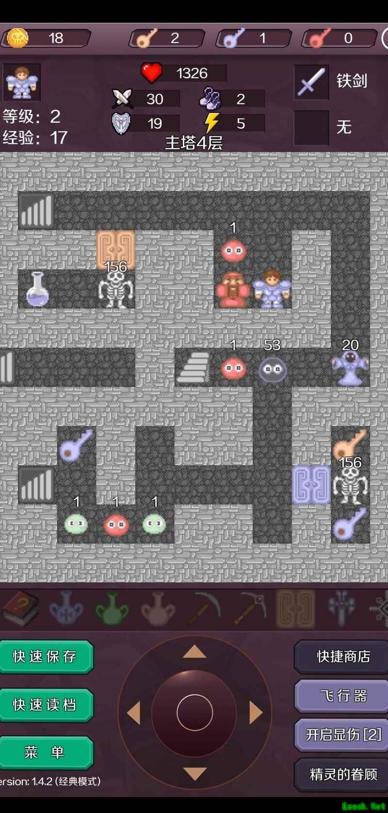 击杀红魔法师后抵达17层,使用飞行器快速穿梭获取宝石进入18层(此为节省钥匙的常规操作,可参考相关攻略)。出售一把红钥匙,将攻击力提升至377,逐层清理可无伤应对的小怪,登上19层后继续购买装备,使攻击力达到425。