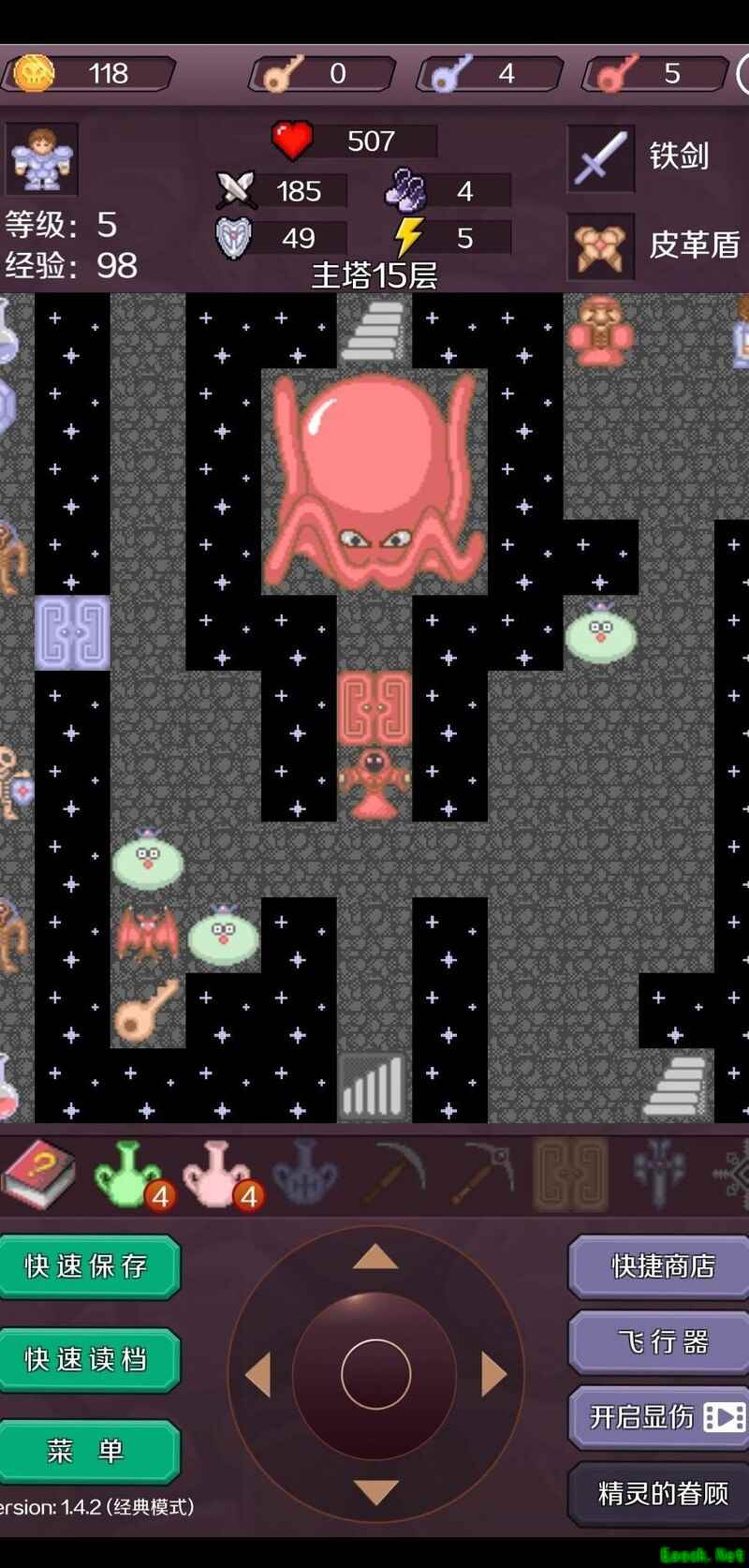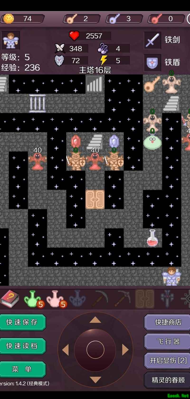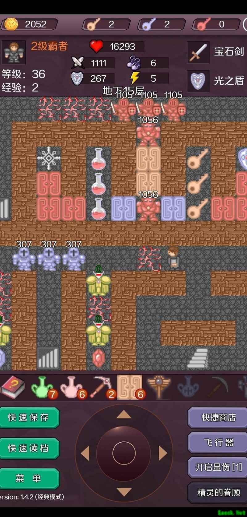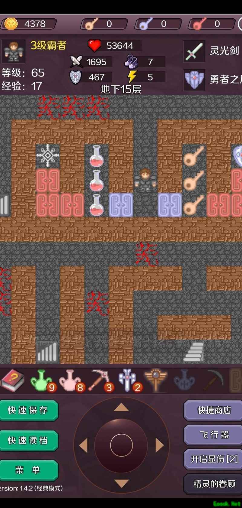 击杀红魔法师后抵达17层,使用飞行器快速穿梭获取宝石进入18层(此为节省钥匙的常规操作,可参考相关攻略)。出售一把红钥匙,将攻击力提升至377,逐层清理可无伤应对的小怪,登上19层后继续购买装备,使攻击力达到425。