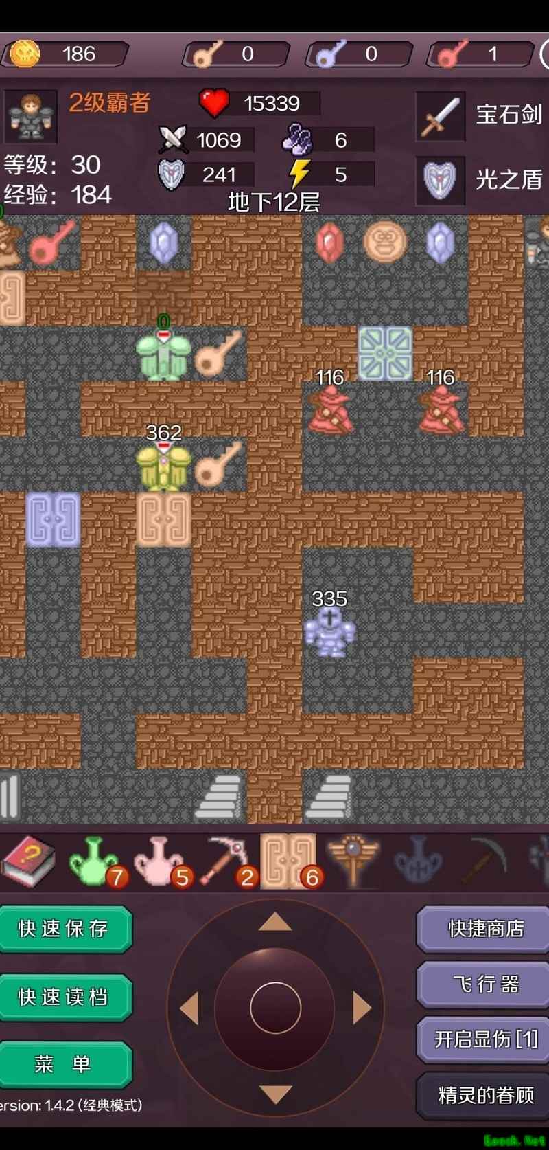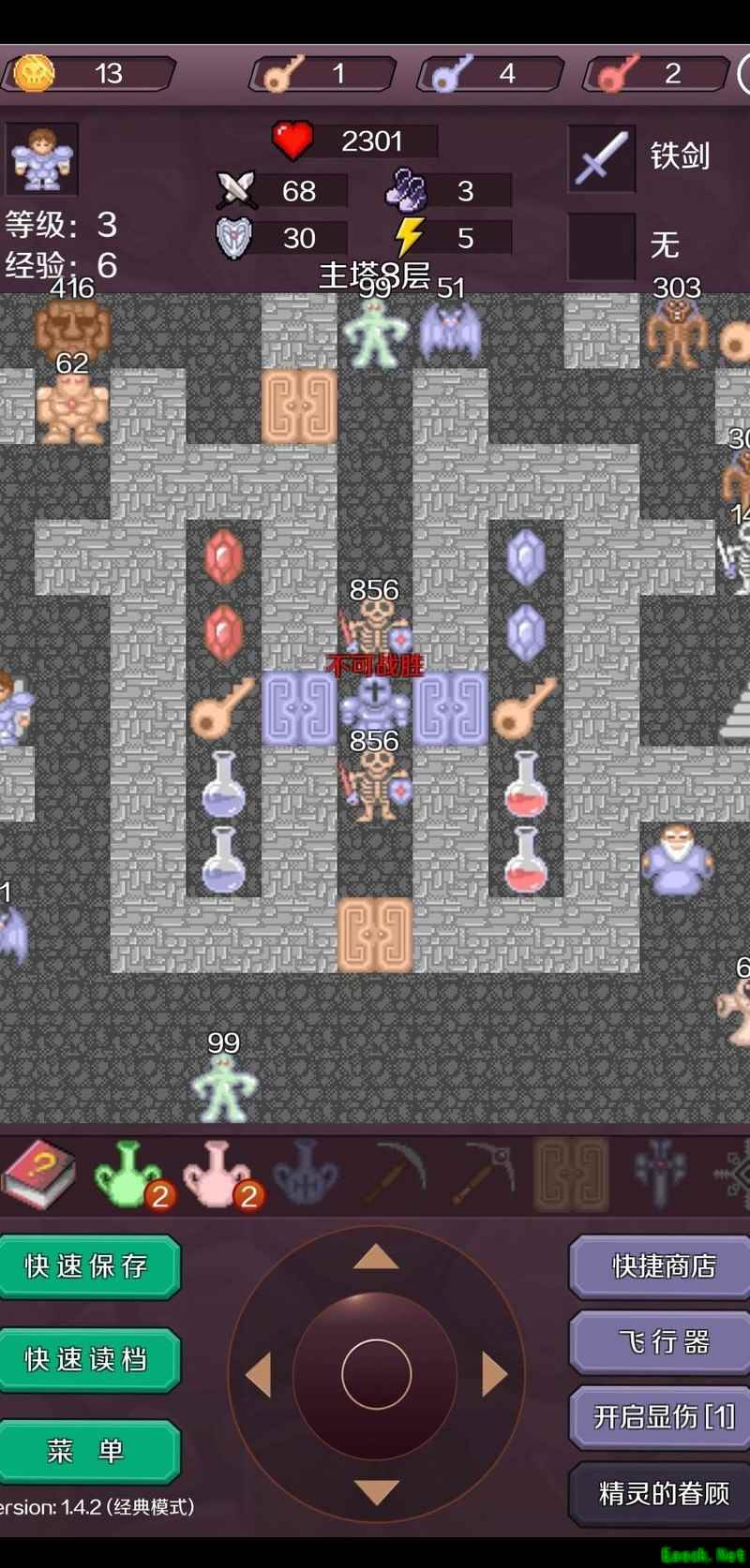 返回B9层,消耗380点血量击败绿魔王,进入B10层清除阻挡怪物后下至B11层,购买一把蓝钥匙。从左侧通道前进抵达B12层,升级三次达到29级,随后进入B13层。使用飞行器传送至B13层右上区域,购入两把黄钥匙,清理各层无伤怪物(含B1、B6),最终将攻击力提升至1069。