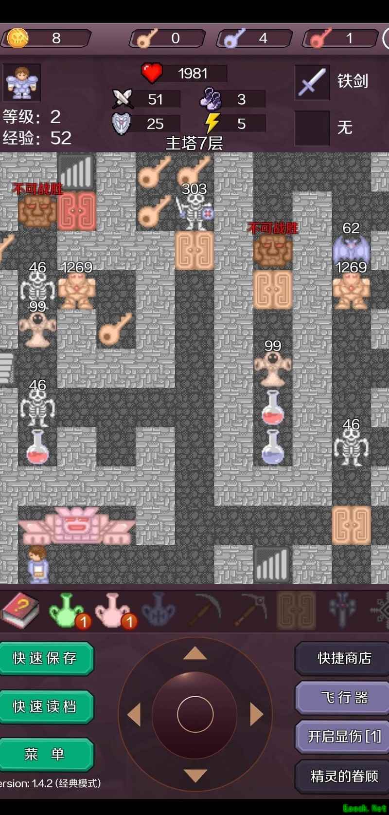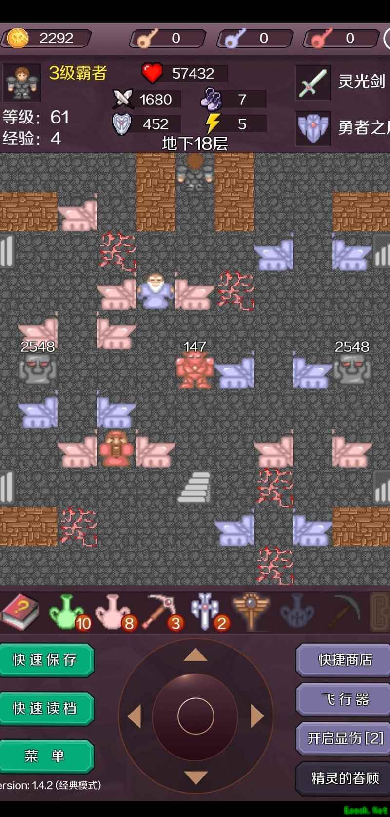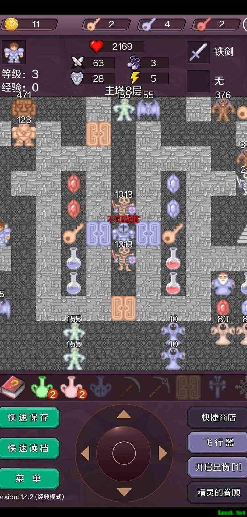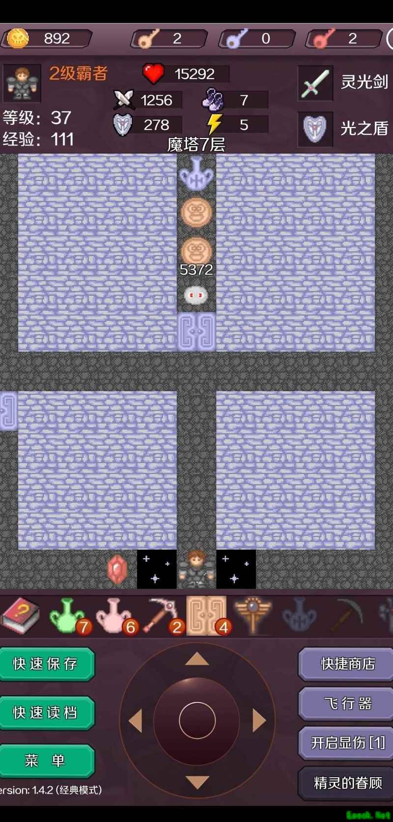 击败剩余的两名白法师后,进入B4层,清理所有可无伤击败的小怪(暂不开启蓝色门)。选择最左侧路线前进(若走蓝门路线也可抵达2102点,虽能获得更高的血量上限,但金币较少,需控制黄色钥匙数量,整体流程细节略有不同,且容错率较低,此处不予详述)。消耗七百余点生命值击败两名蓝骑士,随后开启黄门进入B5层。清除该层所有无伤小怪(右侧黄门暂不开启),使用飞行器前往B5层正上方区域,清理敌人后进入新出现的商店,出售两把红钥匙,将攻击力提升至647(留意此时3层商店数值为142,后续操作请注意存档,避免误购)。返回B1层,开启蓝门并击杀两名灵骷髅,随后进入密室第3层,消灭三名白法师,在此商店将攻击力提升至661。接着无伤击败该层的三名魔法师元帅(后文简称为绿法师),再将攻击力强化至673。之后前往B4层,无伤击杀蓝骑士,最后返回B5层继续推进后续进程。