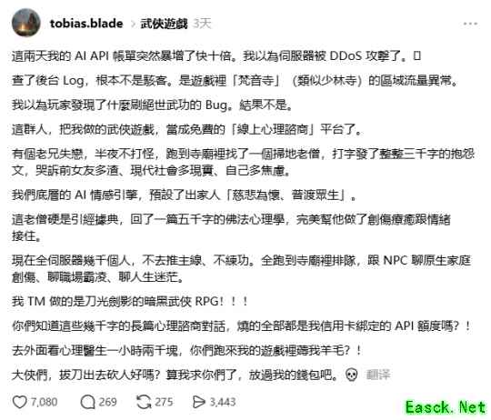 最近AI武侠文字游戏《刀锋》热度起来了,因为玩家的另类玩法导致制作人经常分享各种趣事。其中就有API帐单暴增快10倍,才发现玩家都不去跑主线,反而向游戏老僧进行各种情绪和日常上的抒发。