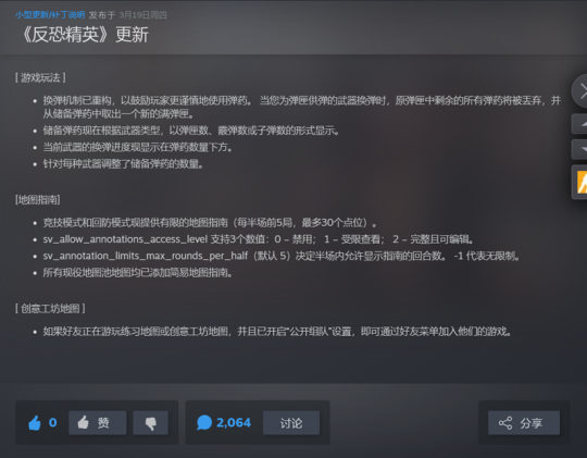 3月19日早晨,Valve推出了CS2更新,该更新重做了武器换弹机制,使用弹匣供弹的武器进行换弹时,当前弹匣中所有剩余弹药将被丢弃,并从备用弹药中更换全新满弹匣。