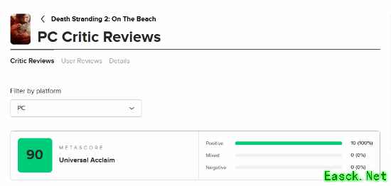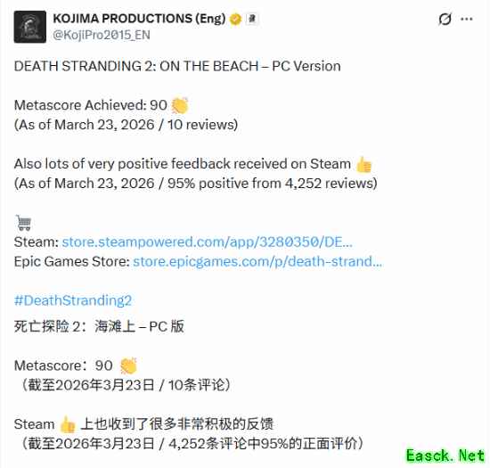 就在刚刚,小岛工作室官方发文,庆祝《死亡搁浅2:冥滩之上》PC版mc站评分升至90!正式踏入90分俱乐部,此前一直是89分。而PS5版依然是89分。
