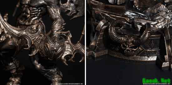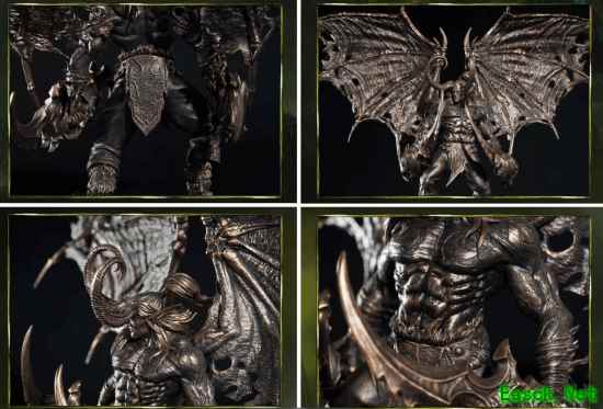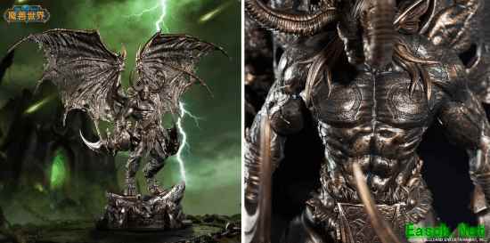 从官方图片看,雕塑师精准还原了伊利丹极具爆发力的肌肉线条、标志性的恶魔之翼,以及那对威名赫赫的埃辛诺斯战刃。手臂上的缠布纹理与铠甲的褶皱细节均被精细刻画。