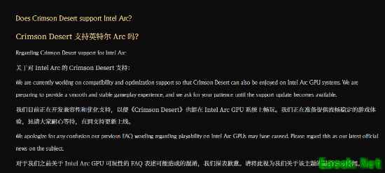 更新后的常见问题解答显示:“我们目前正在开发兼容性和优化支持,以便《红色沙漠》也能在英特尔锐炫显卡系统上流畅运行。我们正准备为玩家提供流畅稳定的游戏体验,感谢您耐心等待支持更新的推出。”