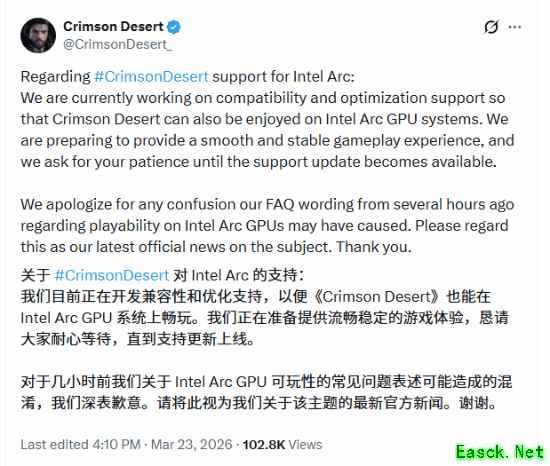 此前,这款开放世界动作冒险游戏的官方常见问题解答(FAQ)中明确写道:“不,《红色沙漠》目前不支持英特尔锐炫显卡。如果您购买游戏时期望获得英特尔锐炫显卡支持,请参考您购买游戏所在平台的退款政策,了解可用选项。对于由此造成的任何不便,我们深表歉意。” 目前这段表述已被修改,表明开发商的态度发生了转变。