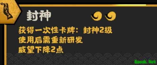 姜尚三技能封神:可获得一张一次性封神卡牌,使用后使范围内敌人眩晕6秒,且优先抽取。