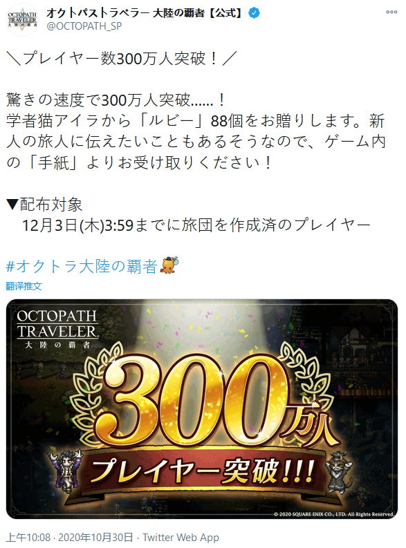 今日(10月30日),SE官方宣布:手游《歧路旅人 大陆的霸者》下载量已突破300万,为了庆贺此事,官方还专门为玩家们发放了奖励道具。
