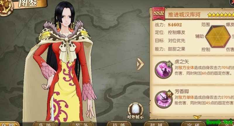 攻击、暴击、速度与闪避提升30%,与路飞一同出战时免疫控制,当路飞生命值低于50%时,推进城汉库珂的攻击力和速度额外提升30%。