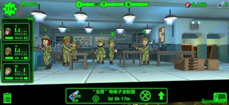 每人配备一把输出17至18的等离子步枪,为提升效率建造了两座武器工厂。装备方面较难处理,但确保每人都穿戴至少三项属性不低于3的蓝色稀有装即可满足需求。