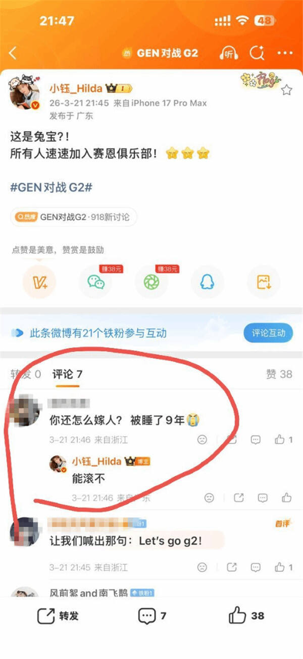事情的起因特别简单,小钰发了条微博,感慨G2战胜GEN的比赛结果太不可思议,本来就是LPL主持人很正常的赛事感慨,结果有个网友直接在评论区跳出来,对着刚分手的小钰阴阳怪气,专拿“嫁不出去”这种话揭人家的伤疤。换谁刚结束九年的感情,被陌生人当众这么戳痛处都忍不了,小钰也完全没惯着,直接回了一句“能滚不”,硬刚得明明白白。