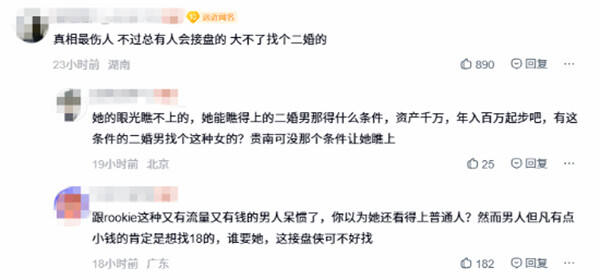 这事一出,评论区直接炸成了一锅粥,网友的态度也分成了好几派。绝大多数人都站小钰,觉得拿“嫁不出去”这种话攻击刚分手的女性,不仅低俗,还满是恶意,人家分手已经够难受了,还要被陌生人追着阴阳怪气,回怼已经是很客气的了,完全是正当防卫。但也有少数人唱反调,调侃说“看来是真破防了”“没戳到痛处怎么会跳脚”,觉得小钰的反应太大,有点小题大做。还有更多路人网友看不下去,直言“差不多得了,人家又没做错什么,何必这么恶心人”。
