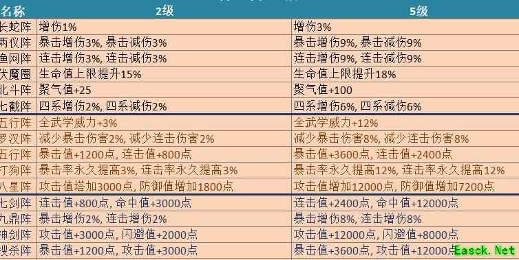 目前市面上流传的版本大多仅更新至天龙阵,且普遍存在版本滞后或数据陈旧的问题,更关键的是未能明确区分武林阵、天龙阵与乾坤阵的界限,而这三类阵法在成本上差异极大。为此特整理一份重制版清单:每张表格前六项为武林阵,中间红色标注的五项为天龙阵,最后蓝色标注的五项则为乾坤阵,结构清晰,便于参考使用。