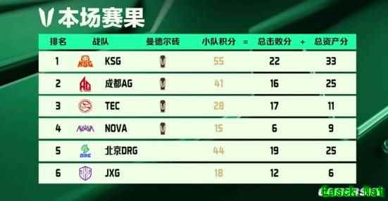 B 组的争夺同样精彩,成都 AG、北京 DRG、JXG、KSG、NOVA、TEC 六支战队也同样打满7局。其中KSG 凭借高效的物资运营与凶悍的团战表现,拿下33 分资产分 + 22 分击杀分,并成功破译曼德尔砖,以绝对优势获得小组第一。成都 AG 稳扎稳打,在多局曼德尔砖攻防战中默契配合,拿下关键砖稳住积分,以小组第二晋级到半区晋级赛;北京 DRG 虽未夺砖,却以19 次击杀 + 25 分资产分展现出极强的运营与团战能力,成为小组内极具竞争力的黑马。