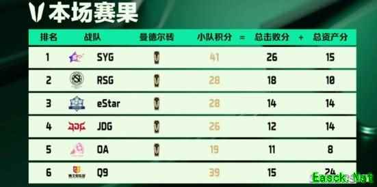 首日赛场高光频出 尽显搜打撤电竞魅力首日比赛中,A 组 eStar、JDG、OA、Q9、RSG、SYG 六支战队率先登场,围绕7 局“夺砖积分制”展开高强度对抗,凭借紧凑节奏、高能对战与戏剧性的赛场表现,为观众献上了精彩的揭幕战。经过 7 轮鏖战,SYG 背水一战,全队状态拉满,最后一局打出7 次击杀并成功破译曼德尔砖,靠着前期积累资源,最后拿到一砖,直接以 41 分登顶,真正演绎了什么叫“不到最后一刻,胜负犹未可知。” 被称为“铲狙代言人”、“航天养蜂人”的高人气选手SYG.成成大王,也凭借出色发挥当选本局 MVP。RSG则稳扎稳打位列次席,两队携手晋级半区晋级赛。而赛前备受关注的Q9战队,则遗憾无缘本周后续比赛,成为第一支淘汰的队伍,不过这仅仅是第一周比赛,期待他们后续周次的表现。